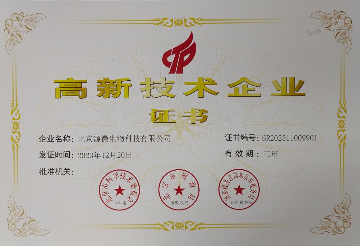 北京源微生物科技有限公司于2023年12月20日喜獲國(guó)家高新技術(shù)企業(yè)證書(shū)。