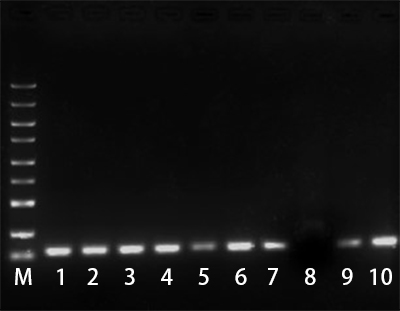 1為PCR擴(kuò)增產(chǎn)物與水1:1混合后電泳結(jié)果(未處理對(duì)照)。
